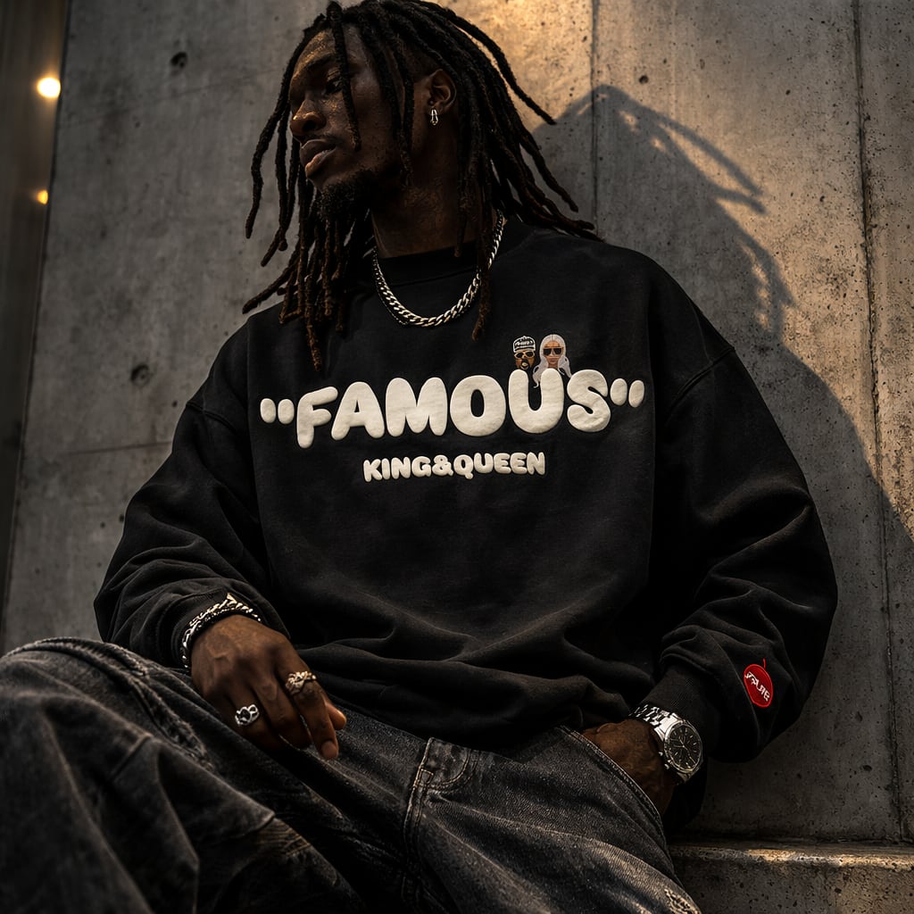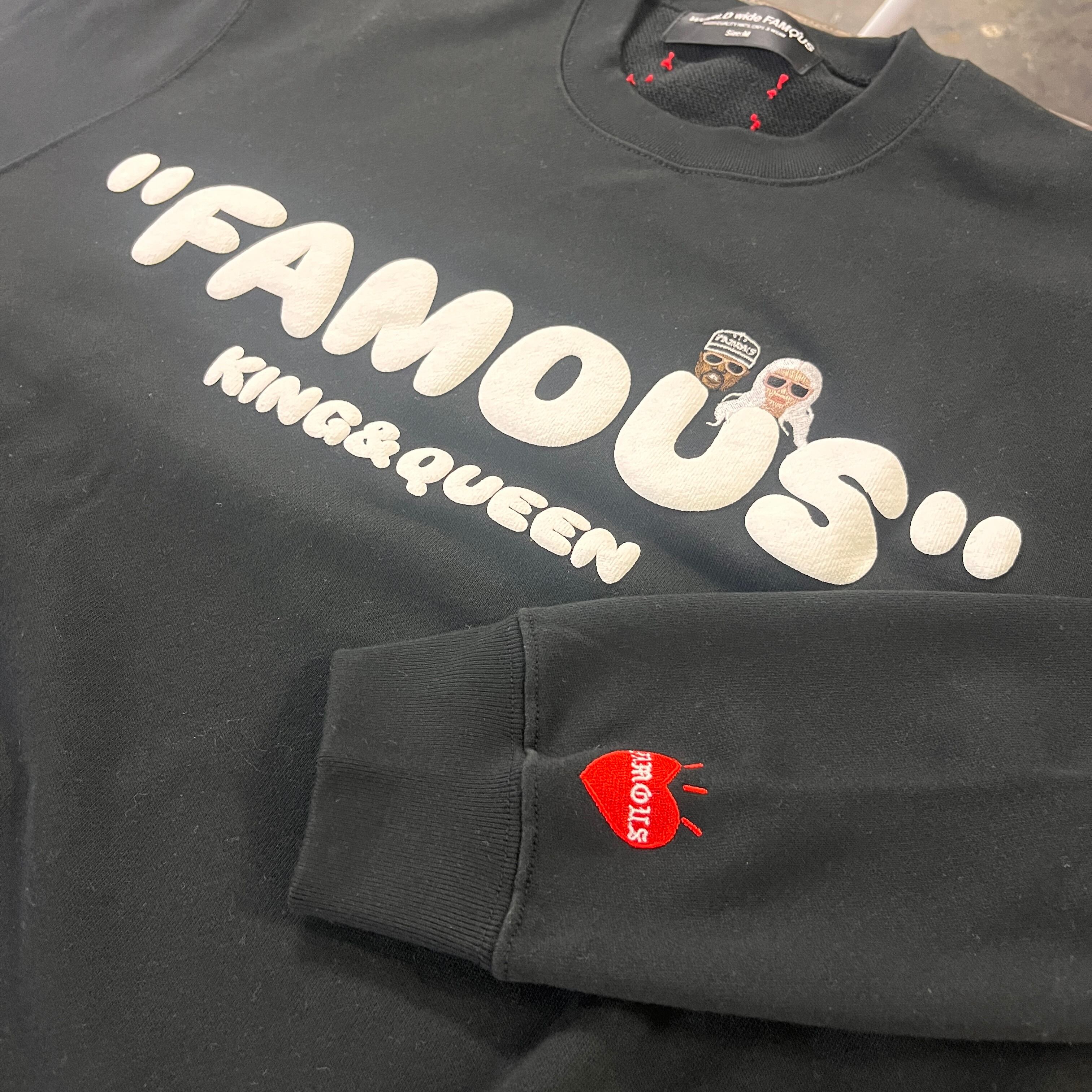 ・WORLD wide FAMOUS の定番デザイン KQ crewneckをBENEカスタムし左袖にFAMOUSハートを刺繍、後ろ首にはBENE OSKタグを縫い付けた仕様のトレーナになります。