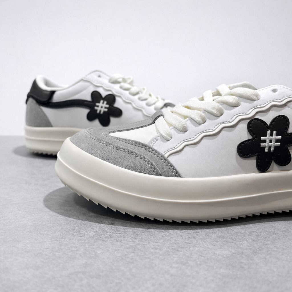ホワイトのボーン ヴィンテージは、遊び心のあるエッジを効かせたレトロスタイル。滑らかなホワイトレザーにグレーのスエードオーバーレイを組み合わせ、大胆なブラックのフラワースウッシュで仕上げたこの一足は、ヴィンテージコートの美学と個性的なディテールを融合させています。