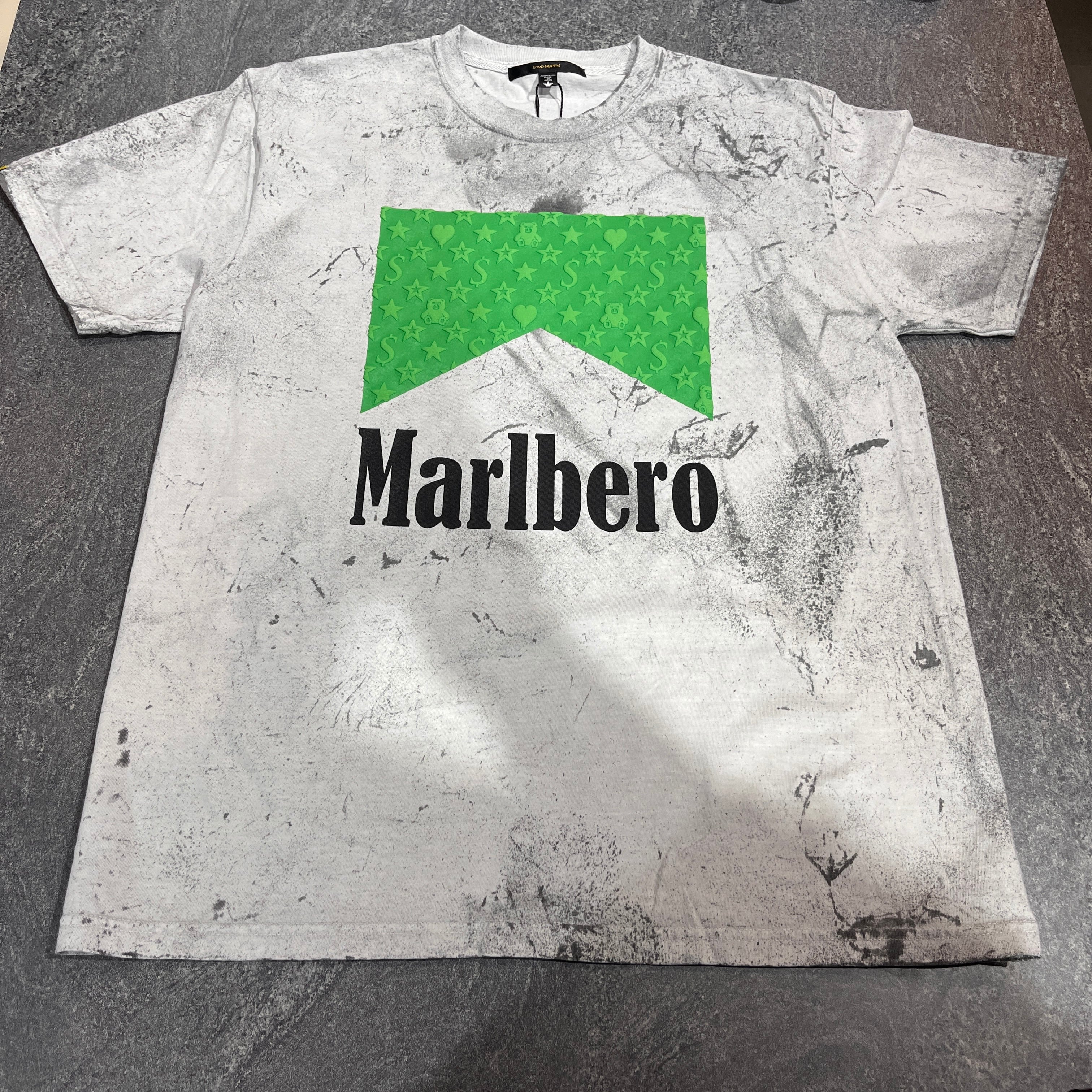 STUD MUFFIN (スタッドマフィン) 7oz ピグメントウォッシュドコットン 天竺 MARLBEROフォームプリント Tシャツ ライトグレー