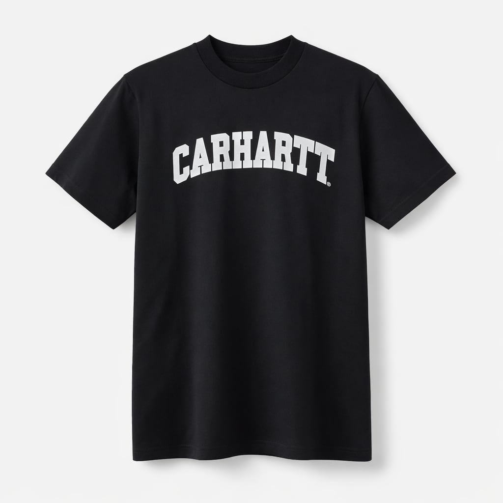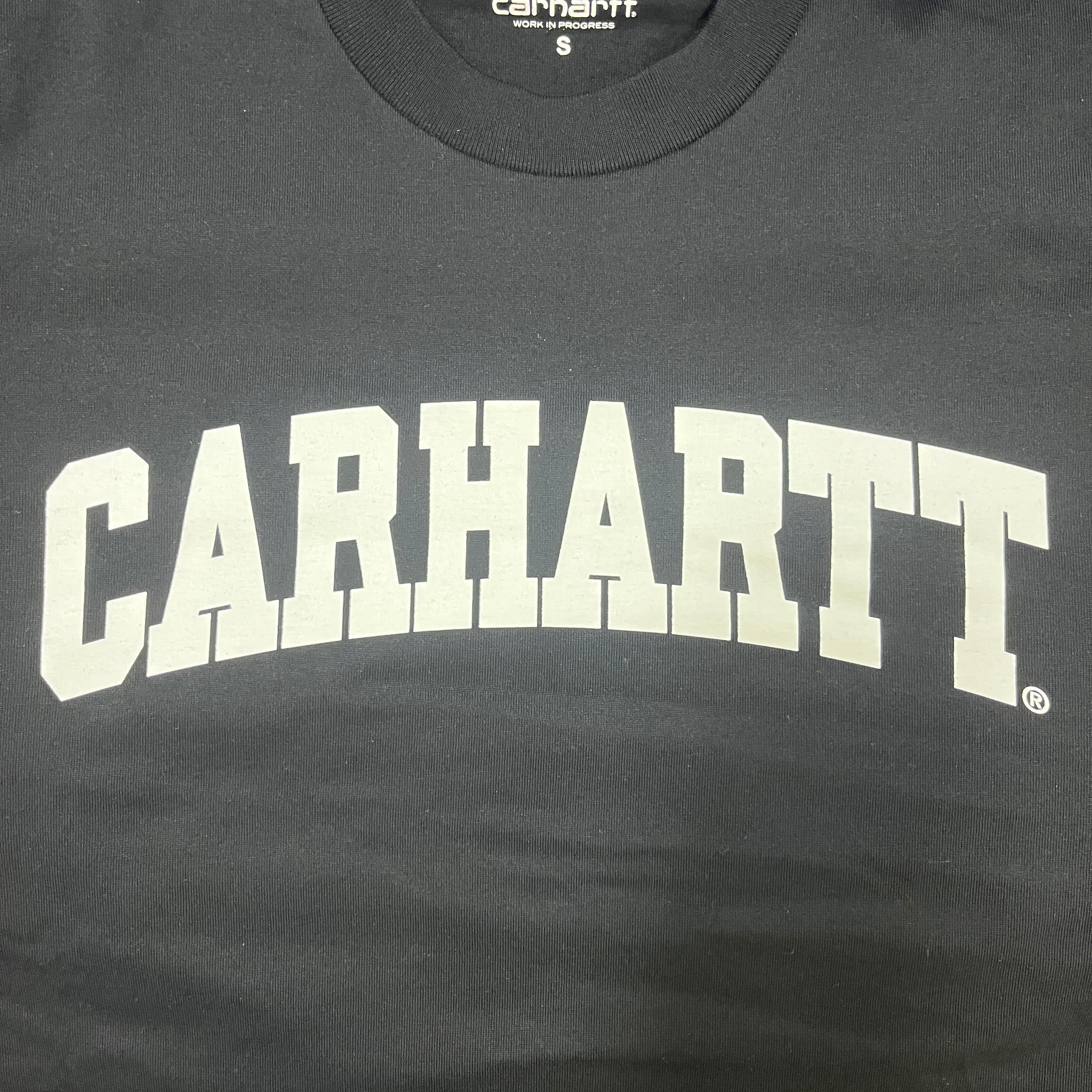 シンプルなカーハートカレッジロゴがフロントにプリントされたTシャツ。