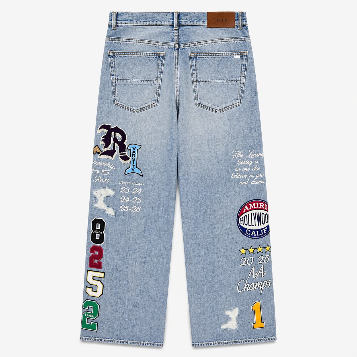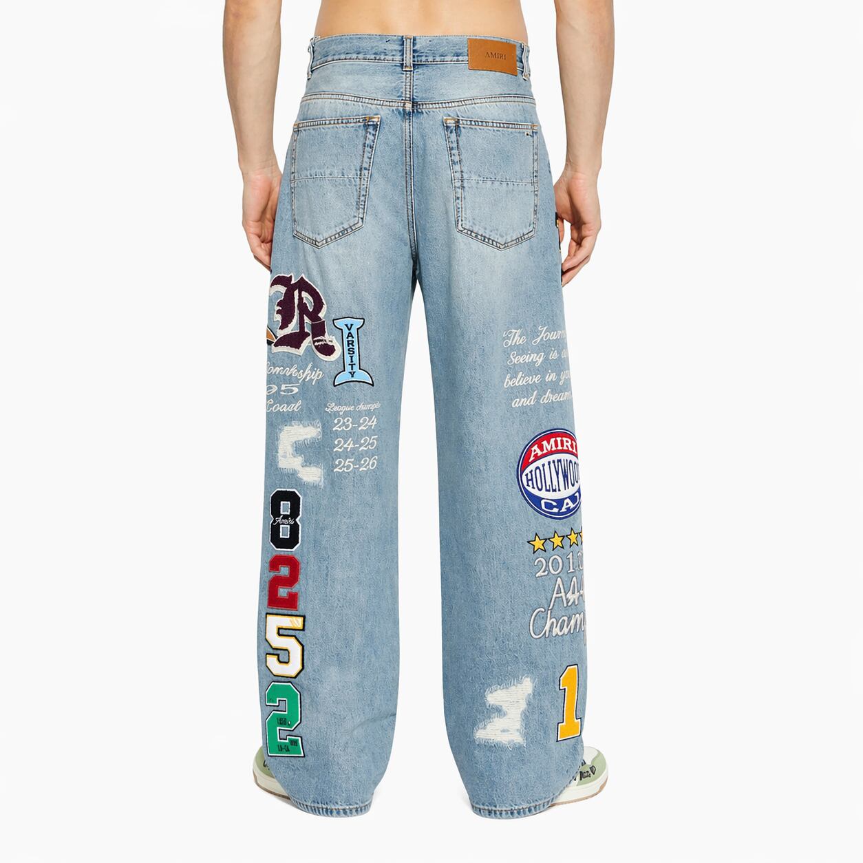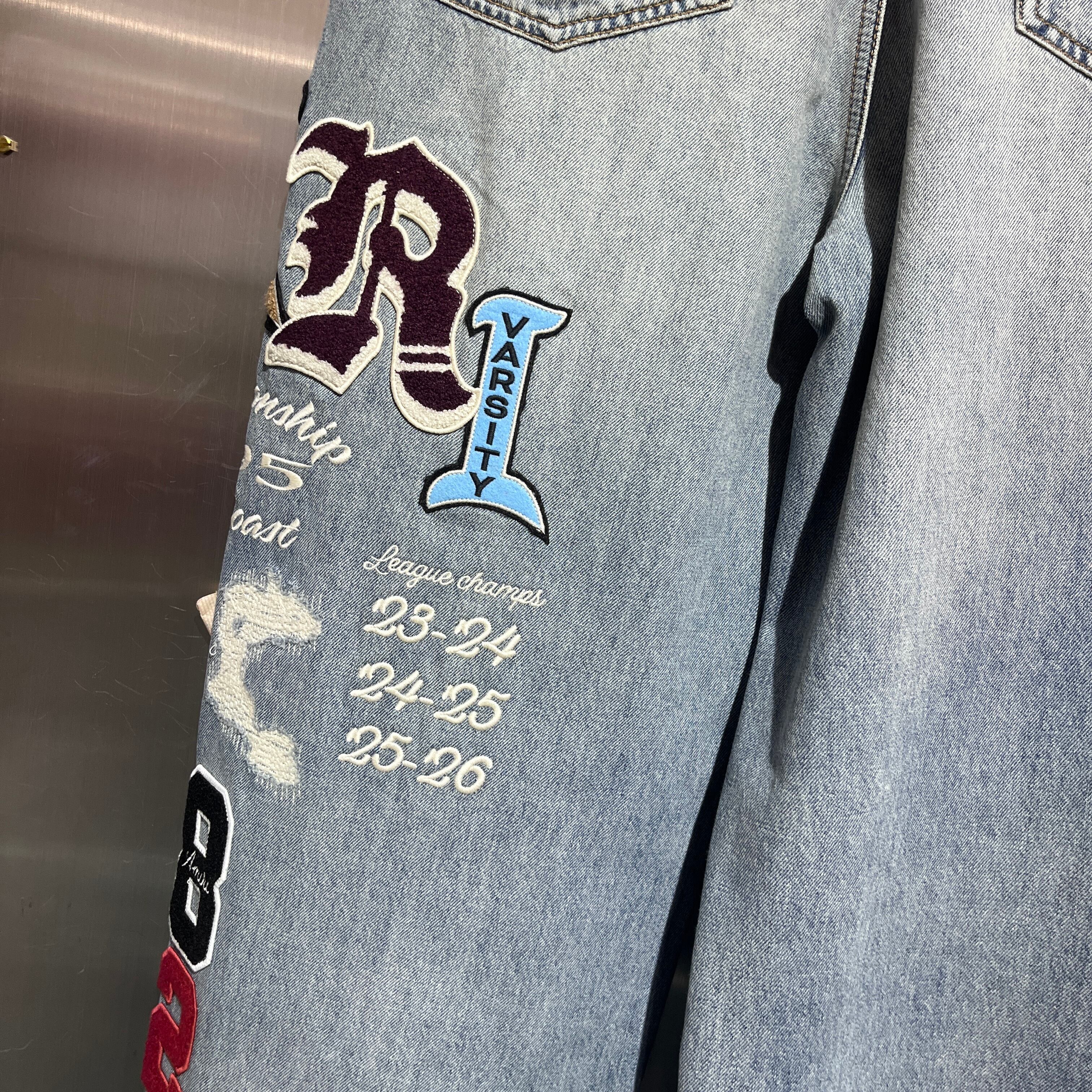文字、数字、紋章の形をした多数の対照的なパッチが、綿密な刺繍で仕上げられ、脚の前後の表面に施されています。ダメージ加工され古くなったデニムの効果が、独特で前衛的な個性を与え、着用者の個性を際立たせています。