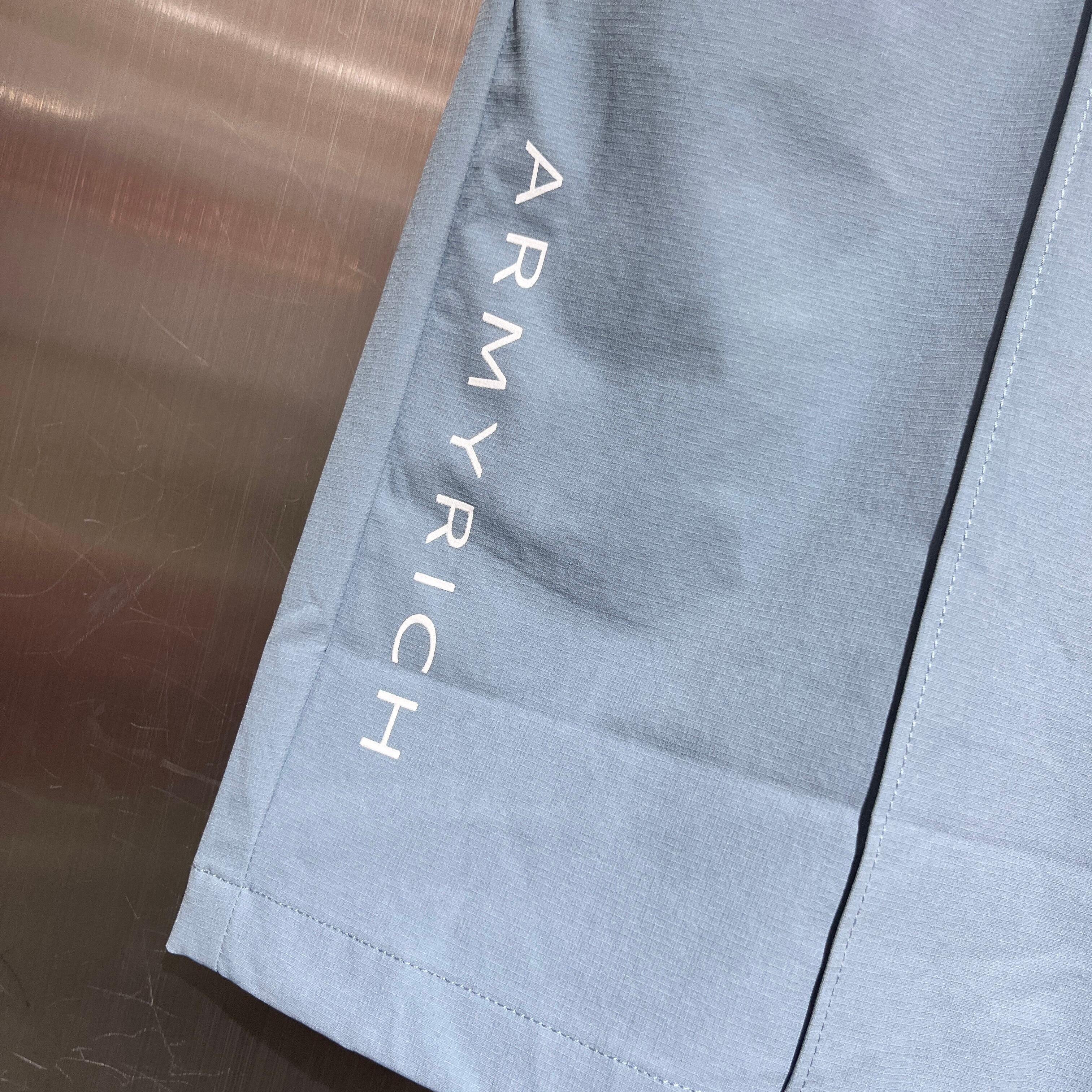 ARMYRICH(アーミーリッチ)ストレッチナイロンTシャツセットアップ 超軽量 吸水速乾 薄手 ラバープリント ブルー