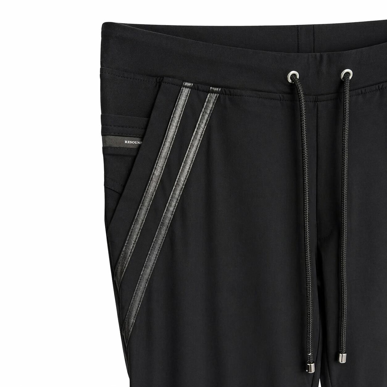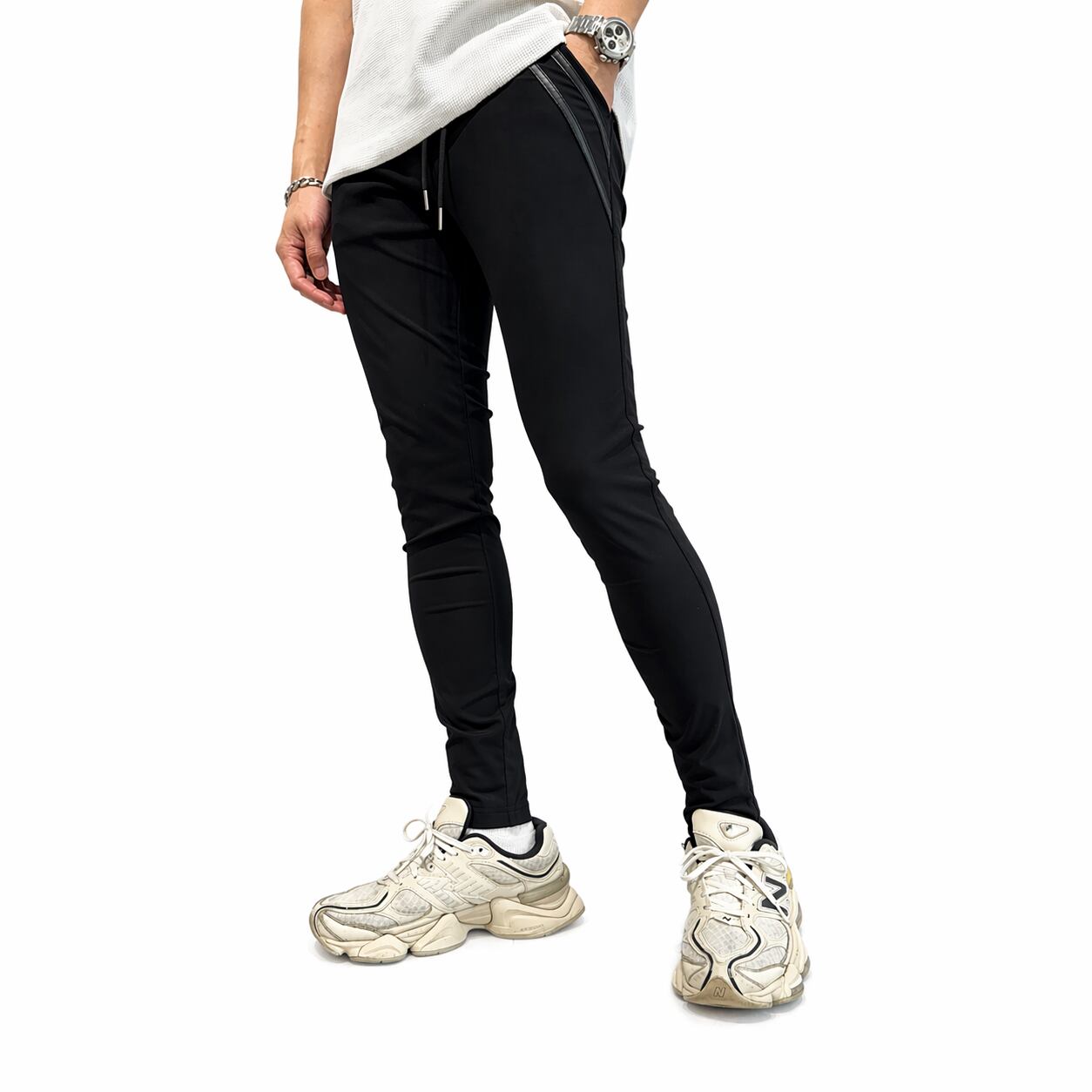 ポケットに合わせたレザーラインがアクセントのラインパンツ